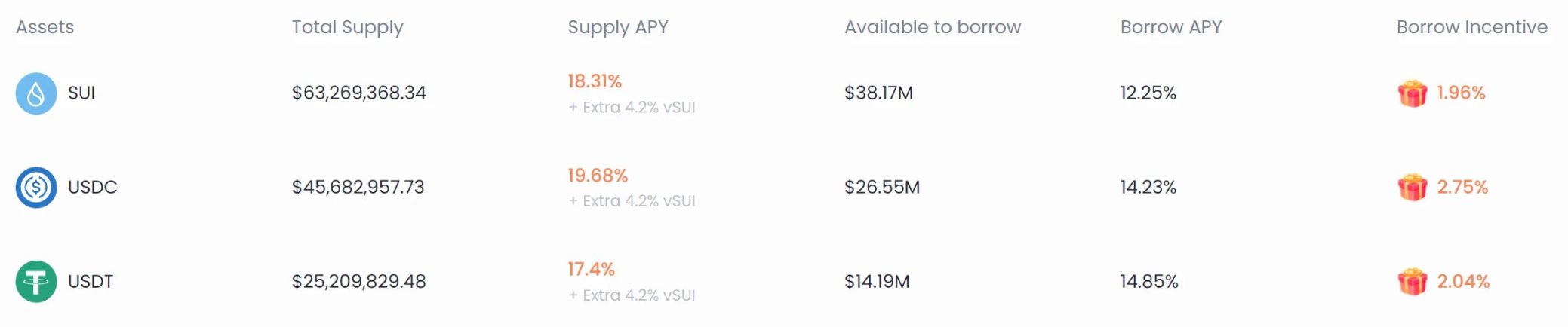 NAVI 的借贷利率模型为双折线利率模型,根据资金池不同的利用率借贷的利息不同,用户能够按照充分市场定价后的利率借款,并将获得 NAVI 的借款激励,如下官方数据显示,SUI、USDC、USDT 的供应利率分别达 18.3% 、 19.6% 和 17.4% 。尤其在市场需求巨大进入第二折线后,叠加 NAVI 所提供的 Boosted 奖励,对于贷方而言,也有着显著收益。