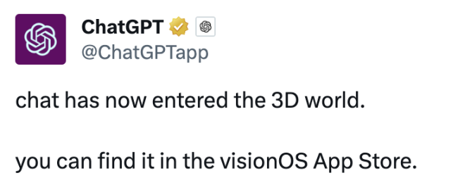 此外,ChatGPT 成为 visionOS 开发的首批应用之一,标志着其在 Apple Vision Pro 操作系统中的重要地位。